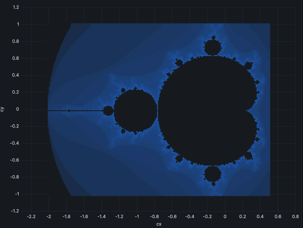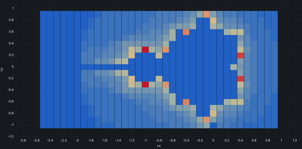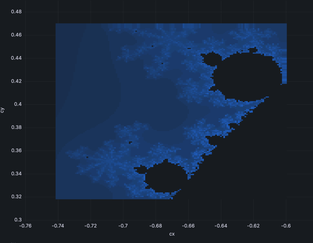 Of course, Grafana is not very well suited for interactive exploration of XY space. It also struggles hard when there are many points to display; my browser just freezes. The last two pictures above have resolutions of 200×200 points or slightly more. This is not too much. In the early nineties, I could easily draw higher resolution visualizations with instant refresh time using direct memory access and switching VGA video pages. Needless to say, computers were 1000 times slower back then.