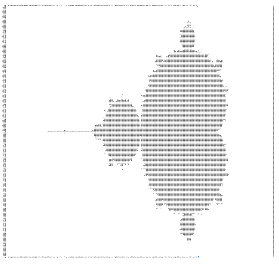 └──────┴─────────────────────────────────────────────────────────────────────────┘By increasing resolution 10 times and remapping zeros and ones to spaces and asterisks respectively, I could get this fancy one: