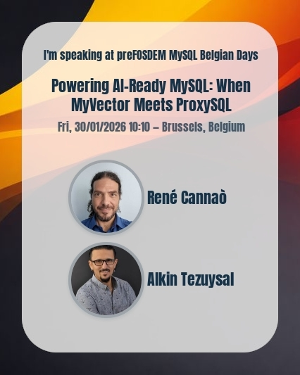 Our Director of Services, Alkin Tezuysal, will be speaking at preFOSDEM MySQL Belgian Days 2026, with his talk: “Powering AI-Ready MySQL: When MyVector Meets ProxySQL”.